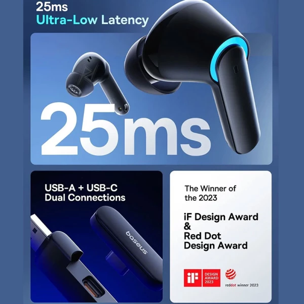 این ایرپاد گیمینگ از برند باسئوس Baseus، در سال 2023 برنده دو جایزه طراحی iF Design و Red Dot Design شده است. طراحی خاص بدنه ی ایرپاد ها، نورپردازی جذاب، بدنه ی نیمه شفاف کیس شارژ و سایز ویژگی های ظاهری منحصربفرد این ایرپاد گیمینگ، موجب شده تا این جوایز معتبر بهترین طراحی سال ۲۰۲۳ را دریافت کند.